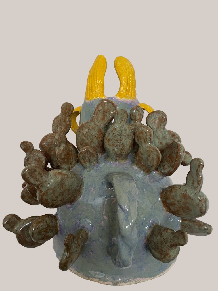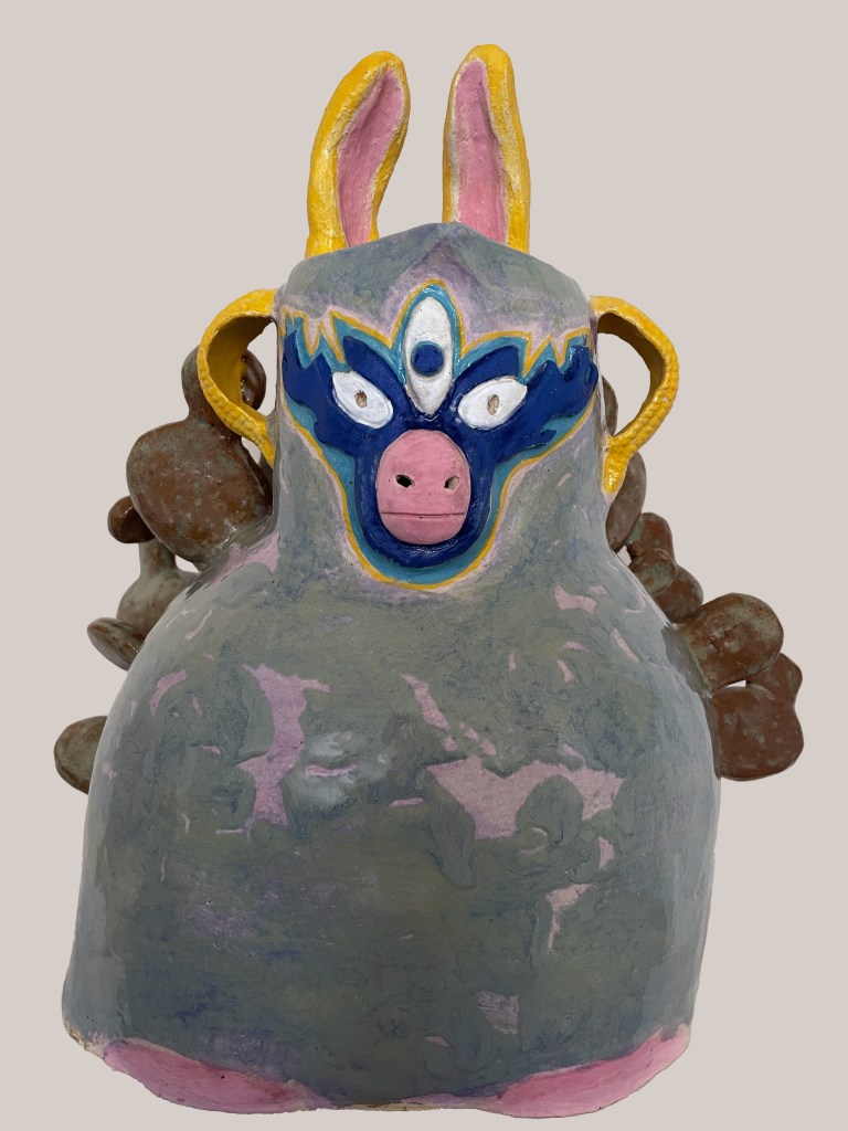 Oregano is the name of this Luchador effigy vessel/sculpture, taken from the potent healing herb. This sculpture has taken on a personality that blends the spiritual with the Earthly, and ferocity with humor. This sculpture possesses both aesthetic and functional pottery elements. Integrating aspects of animal, land and Indigenous Mexican symbolism, this piece is abundant with narrative potential.