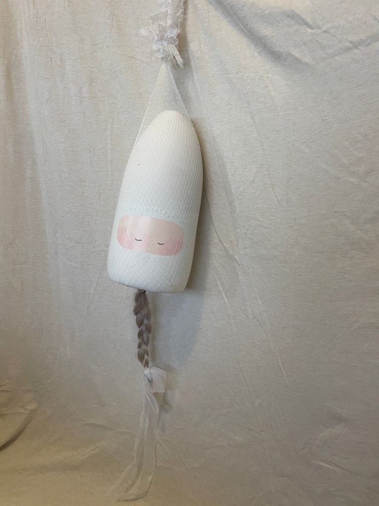 This sculpture is comprised of found materials: a buoy from the side of the road, produce netting, lace, and a lock of hair. Suspended from the ceiling, with closed eyes, this creature, or sculpture, sleeps gently. She has a peaceful and curious presence.